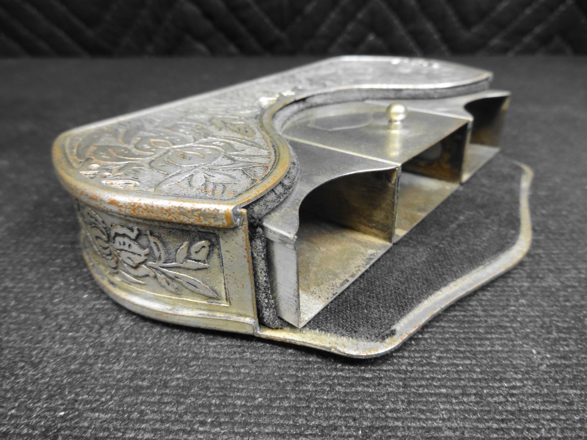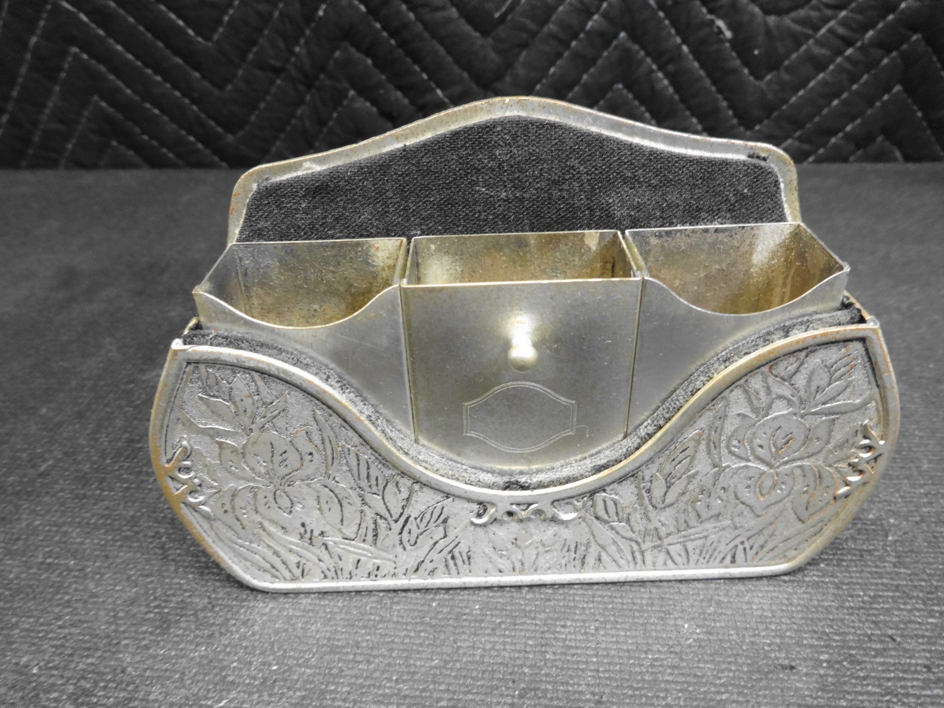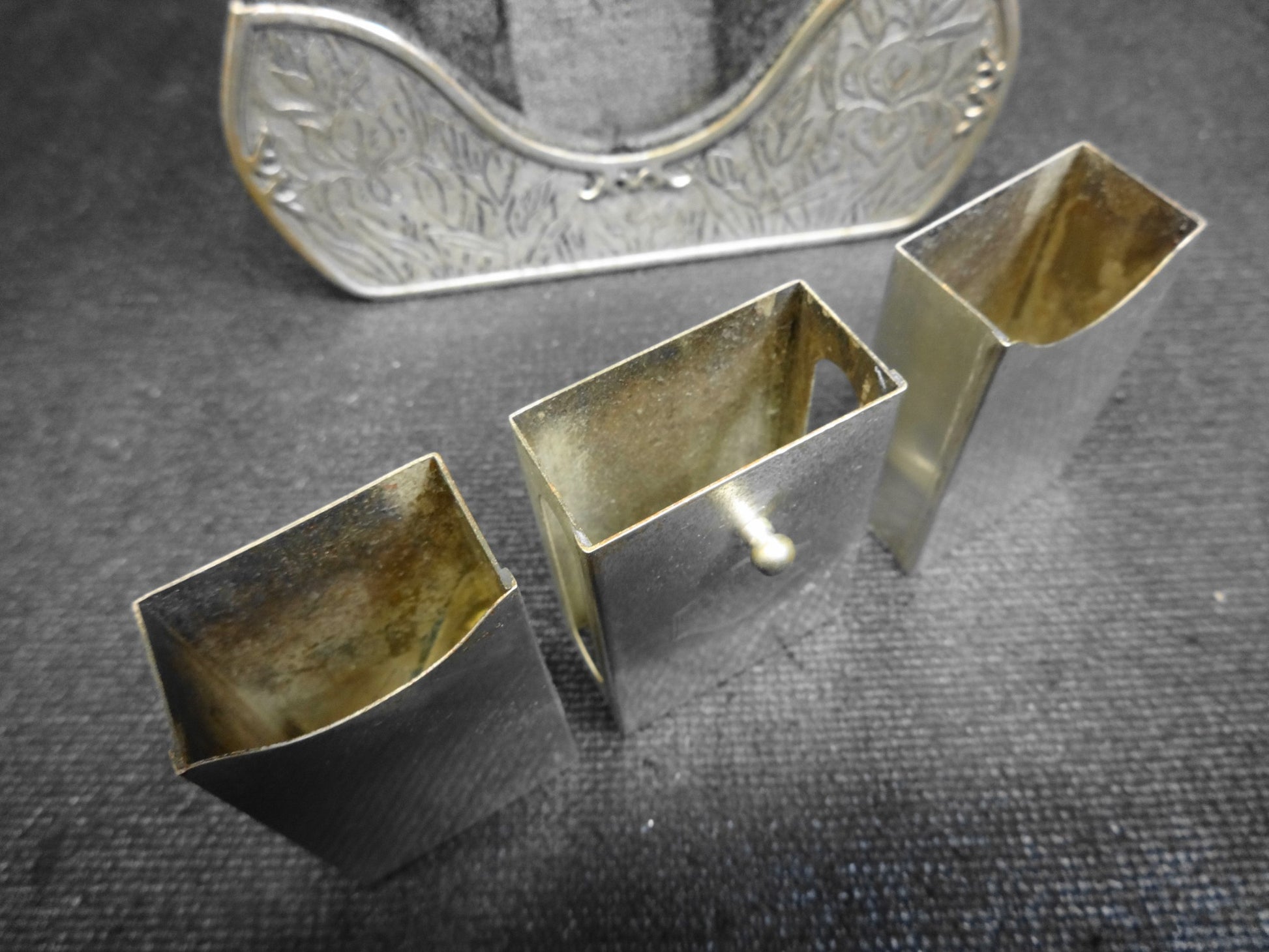 Up for sale is this truly RARE and unobtainable circa 1924-1926 No. 697 Smoking Set by Elgin Clock Company.   The set is felt lined with three compartments.  The first / third compartment would hold cigarettes.  The center compartment is for a matchbox and has oblong holes to allow striking of matches.