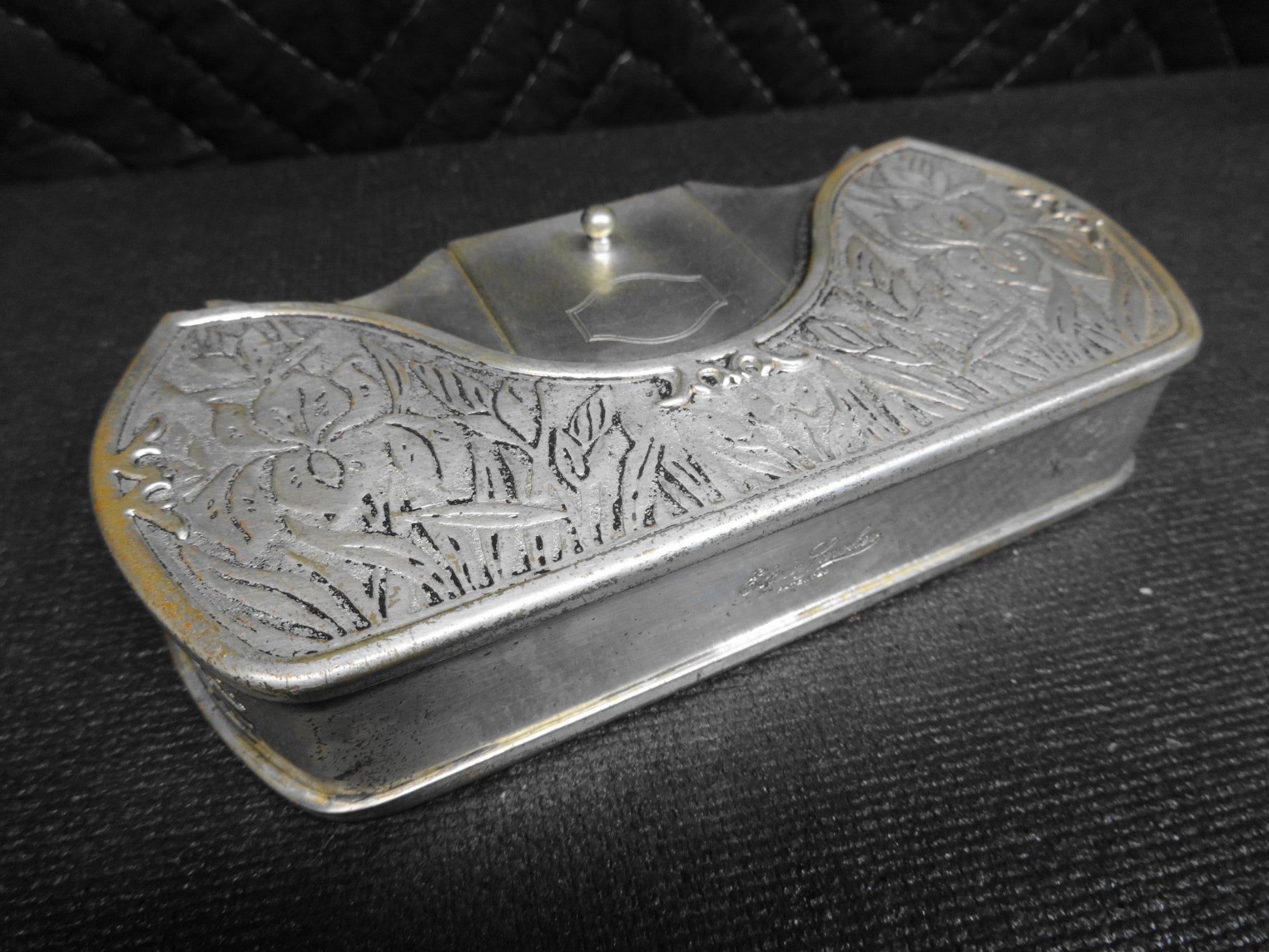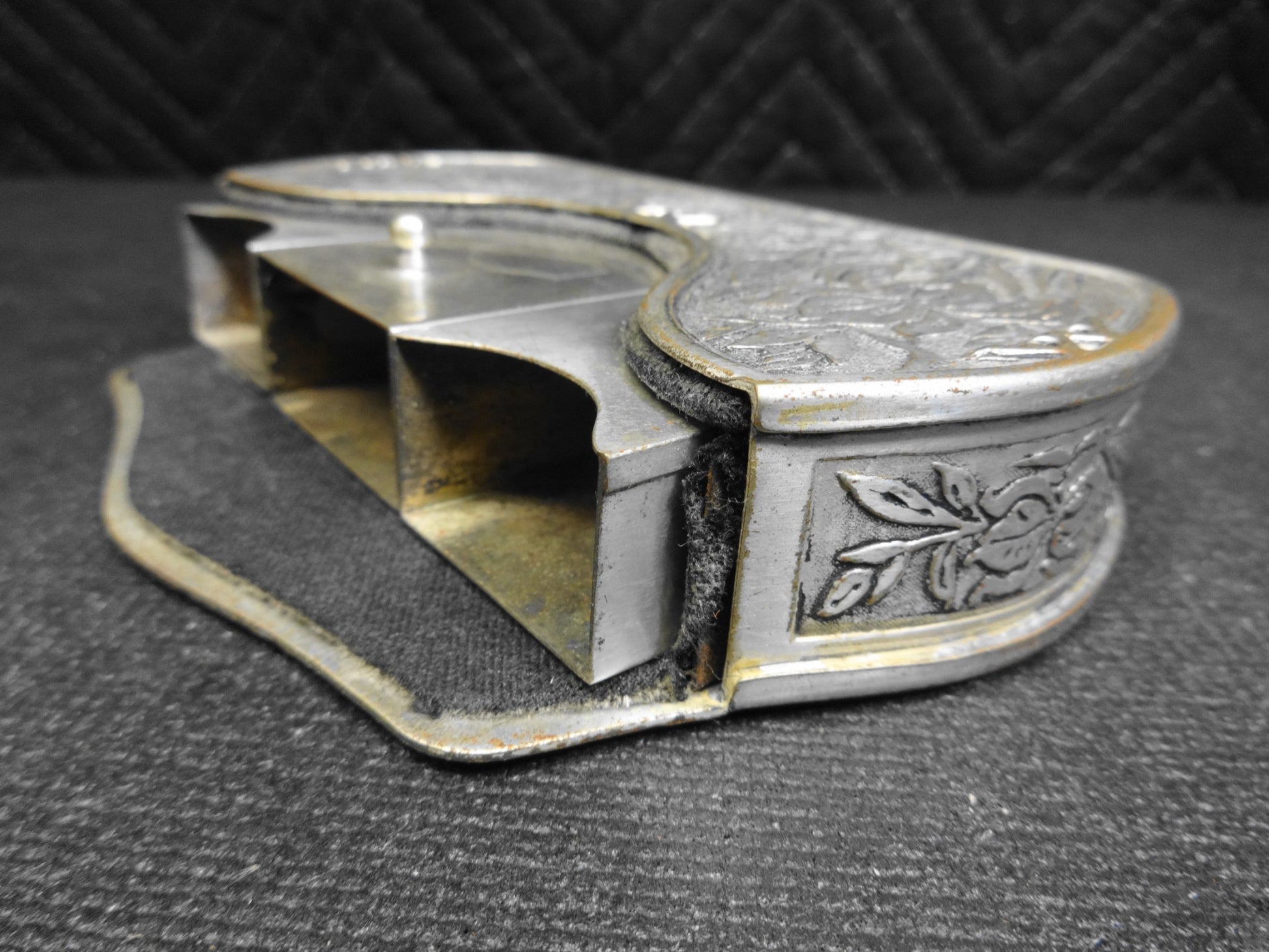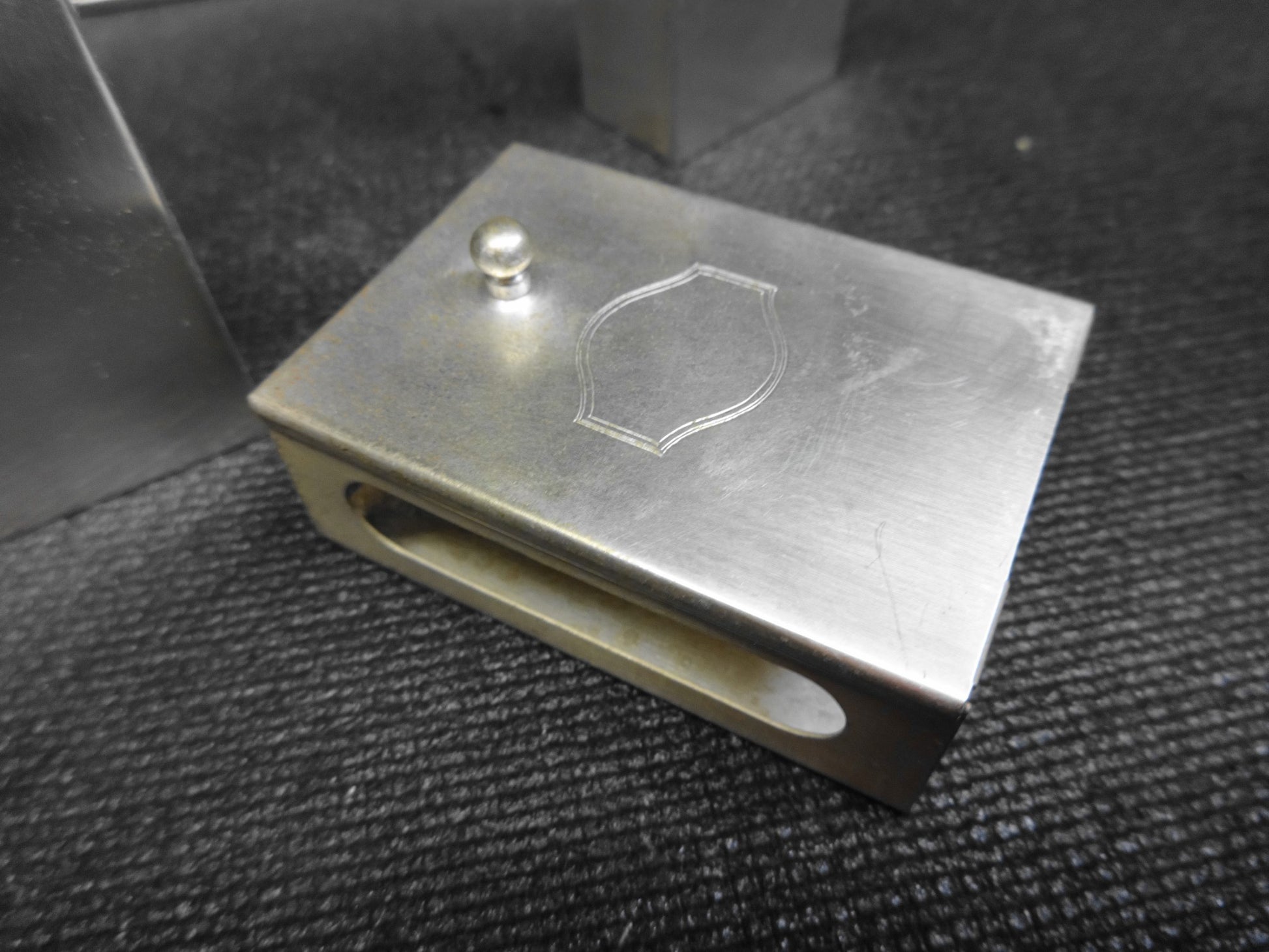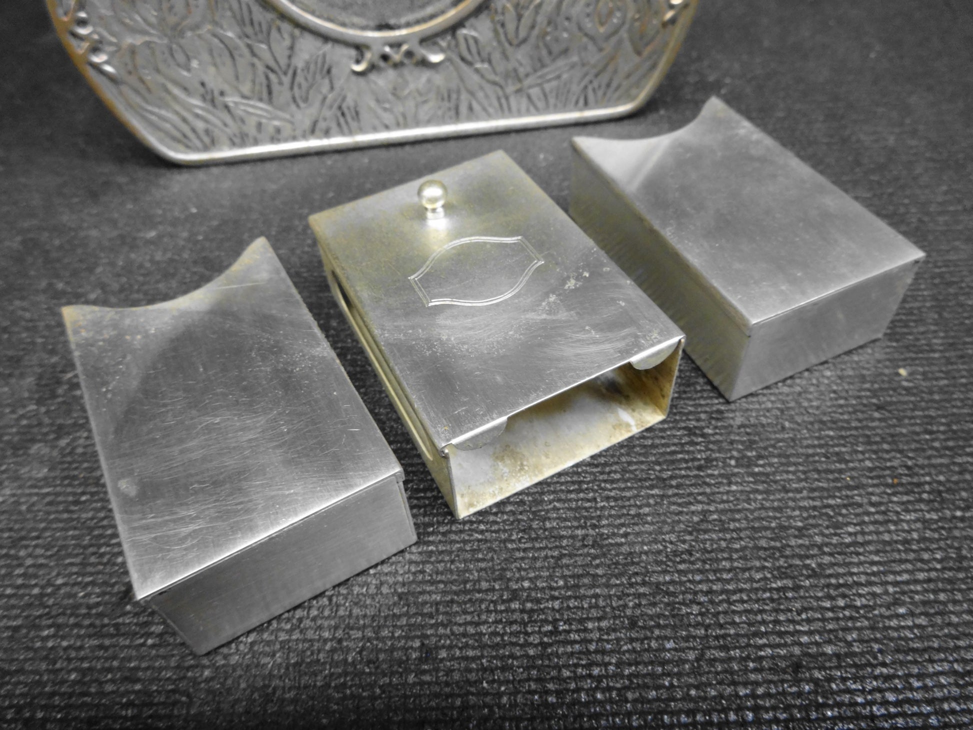 Up for sale is this truly RARE and unobtainable circa 1924-1926 No. 697 Smoking Set by Elgin Clock Company.   The set is felt lined with three compartments.  The first / third compartment would hold cigarettes.  The center compartment is for a matchbox and has oblong holes to allow striking of matches.