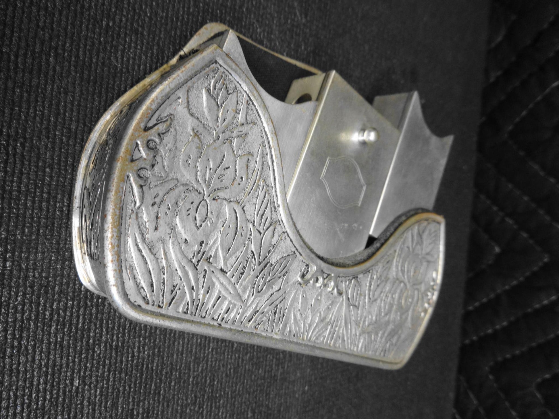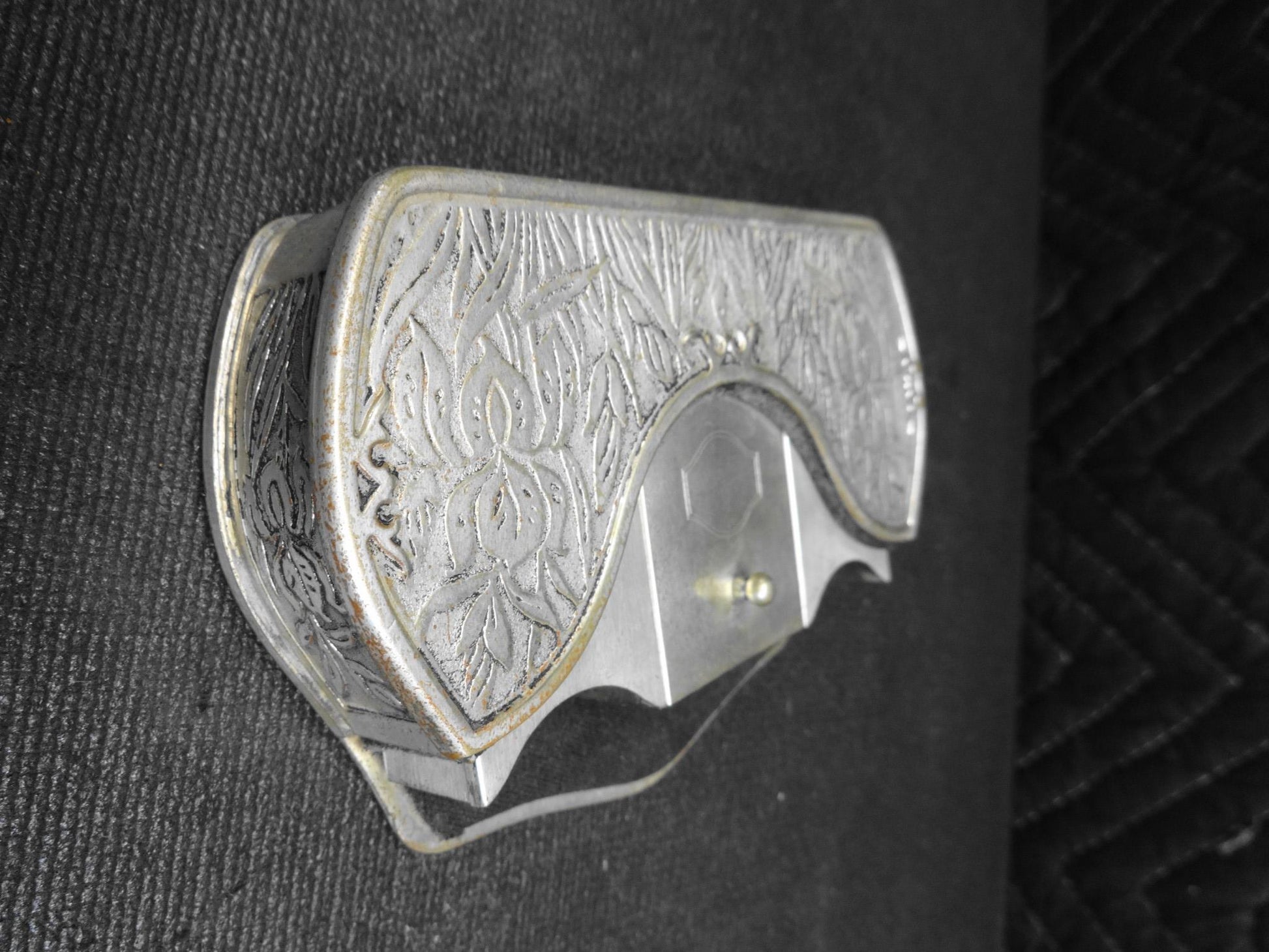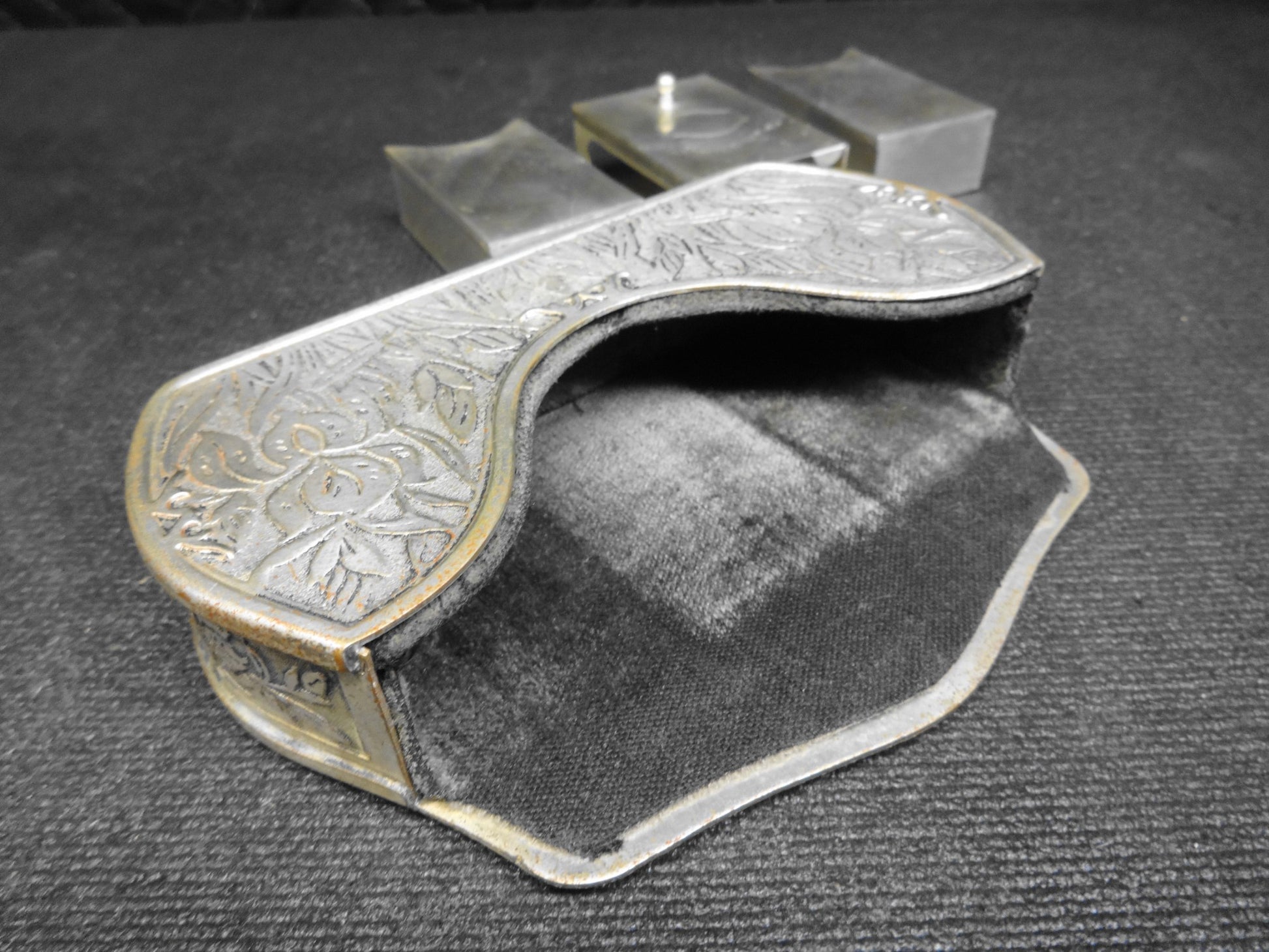It would have originally been mounted to the back of the front seat.  It has time toned from age alone.