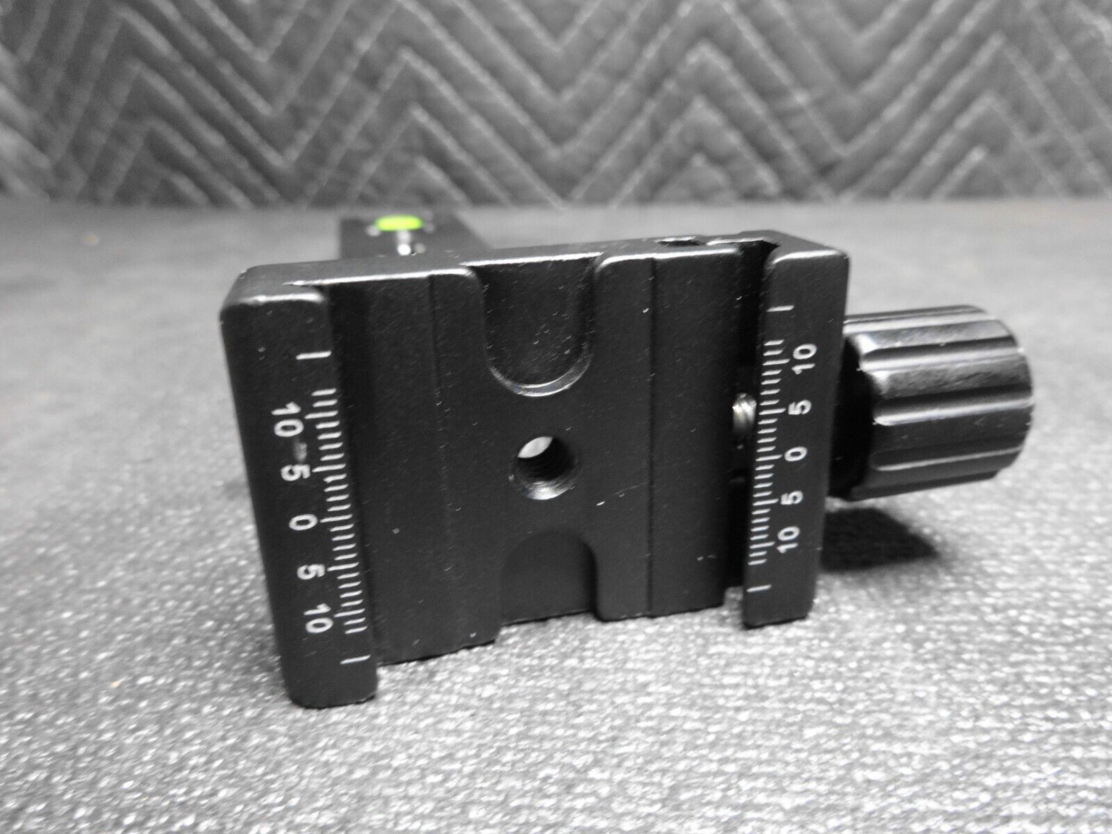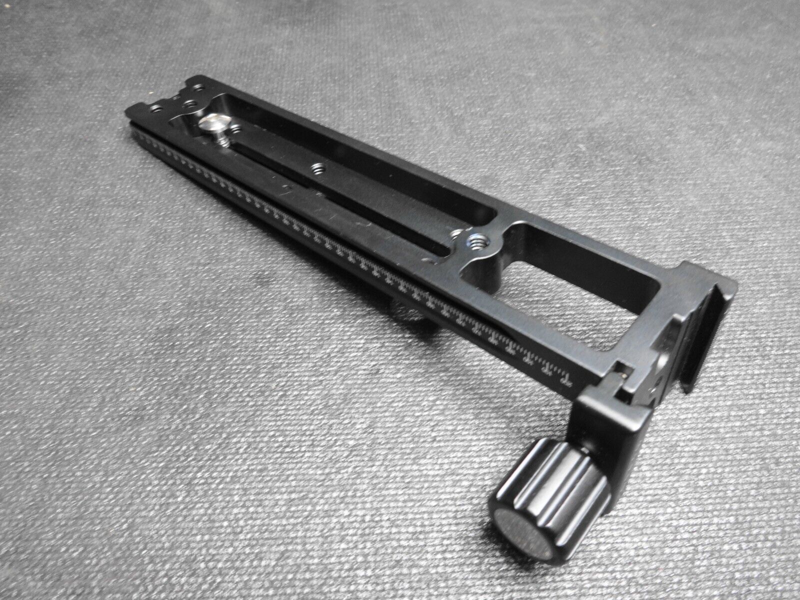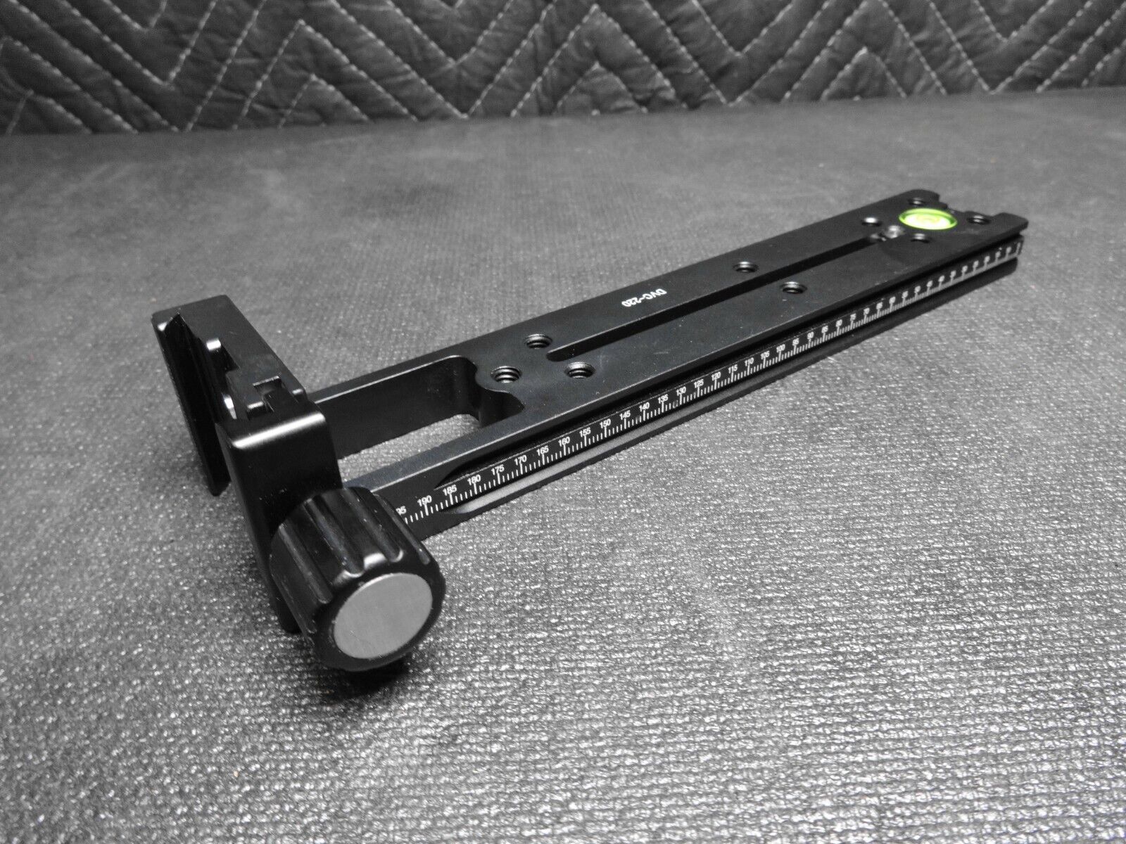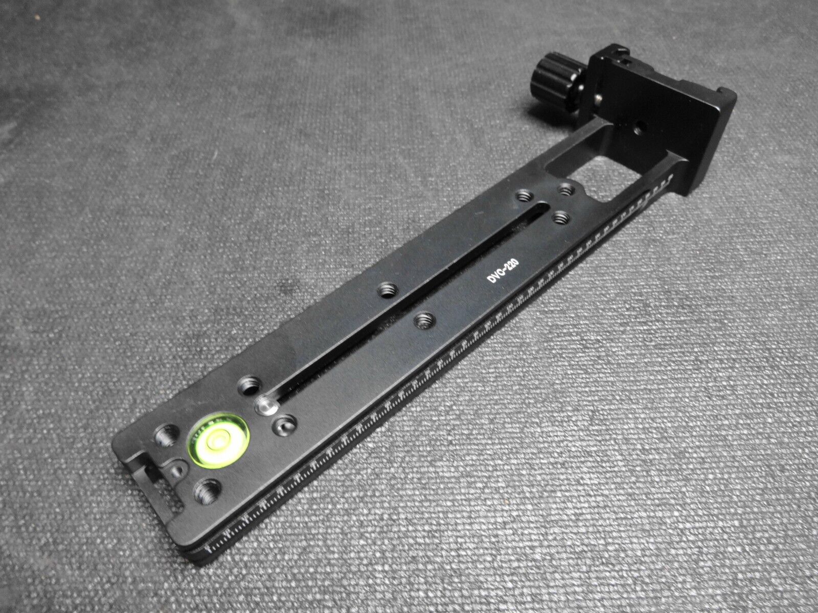 The DVC-220 220mm Rail from Desmond is a horizontal rail with an Arca-type compatible clamp for adding a vertical plate. The rail has dual dovetails, a built-in bubble level, strap slot, and a 1/4"-20 camera mounting screw.