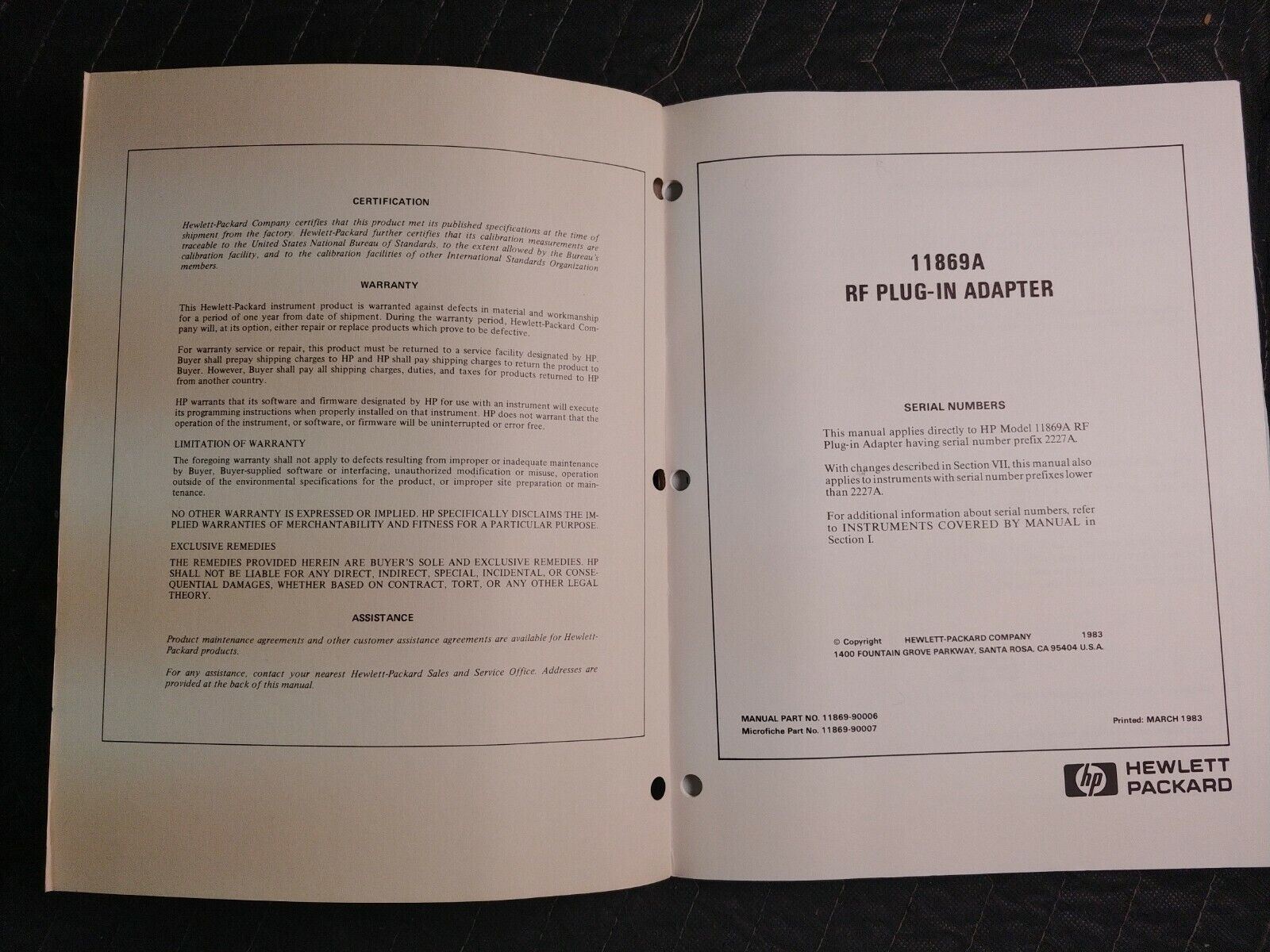 VTG MANUAL - HEWLETT PACKARD HP 11869A RF PLUG IN ADAPTER