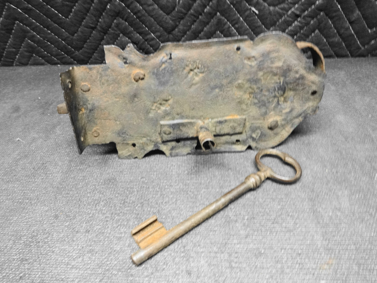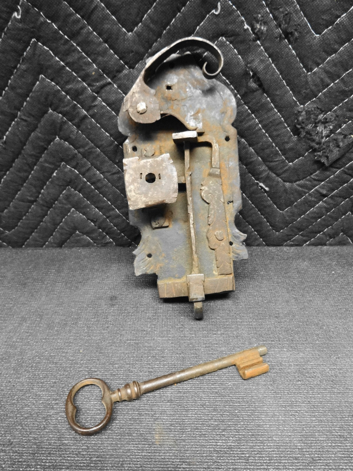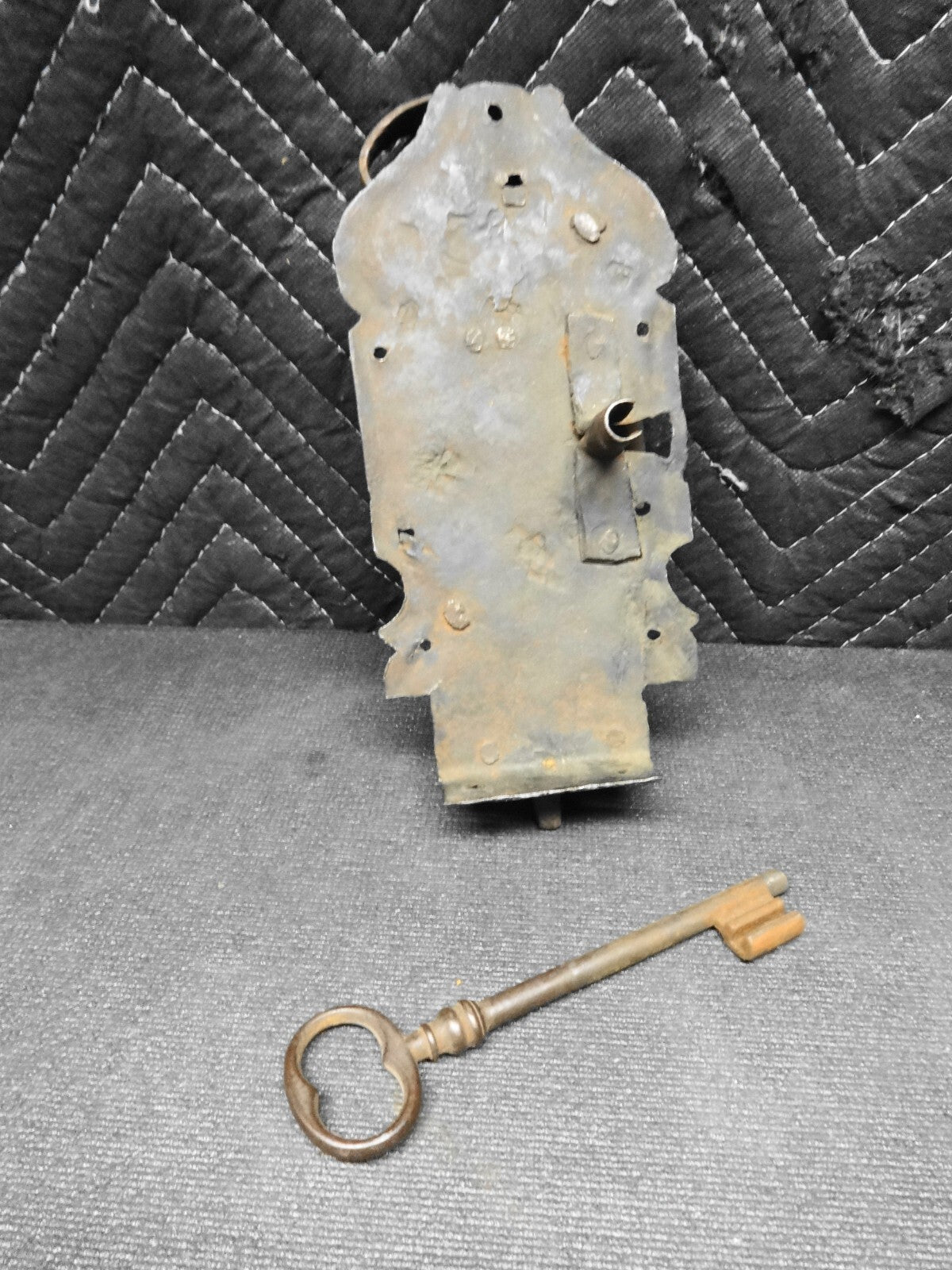 Measures 8" across, 4" tall. Antique lock, wrought iron lock, 17th-century hardware, medieval-style lock, hand-forged lock, rustic door lock, iron door latch, old world lock, cast iron key, ornate lock mechanism, vintage iron lock, historic door hardware, heavy-duty iron lock, gate lock, castle lock, antique skeleton key.