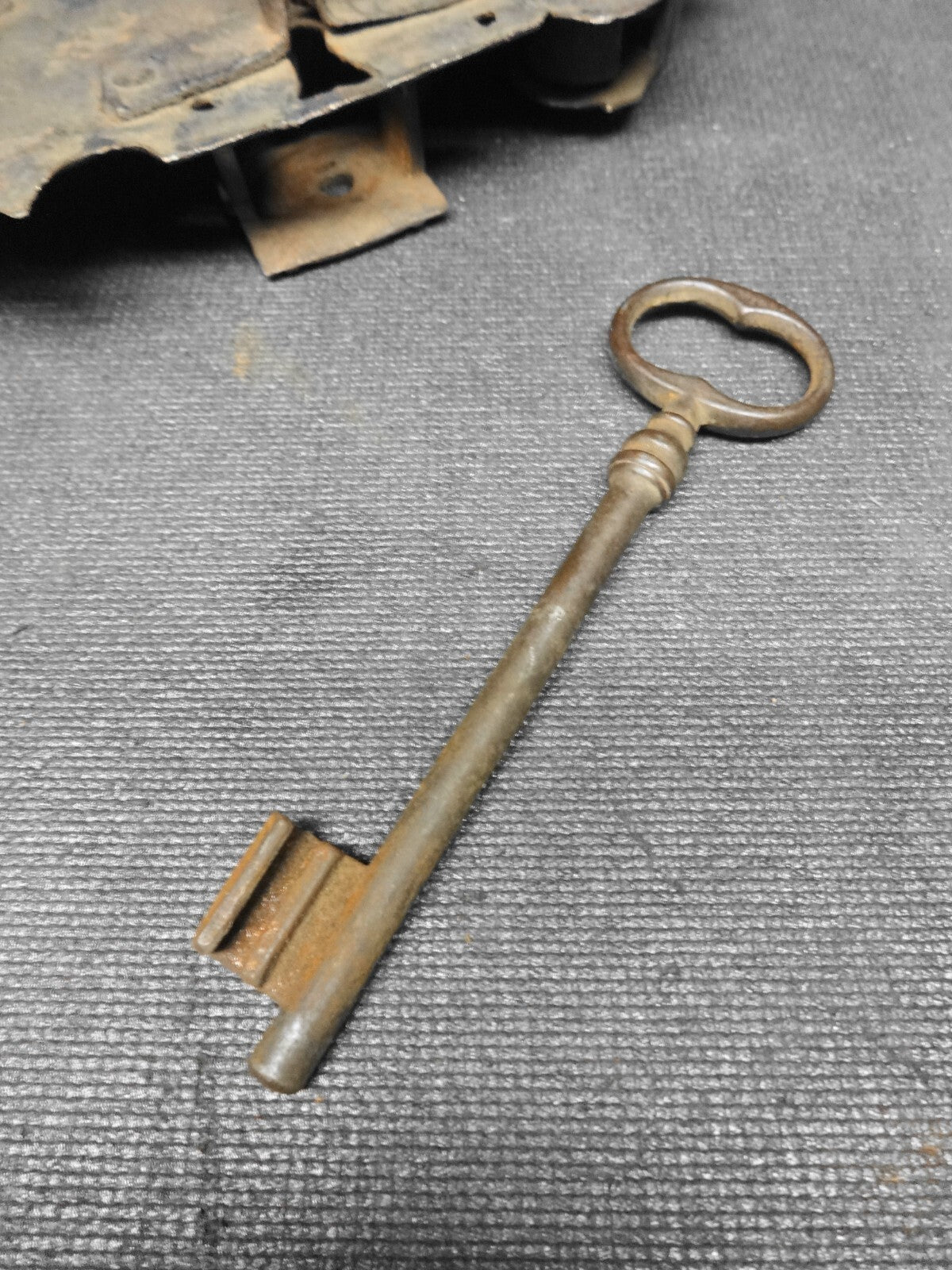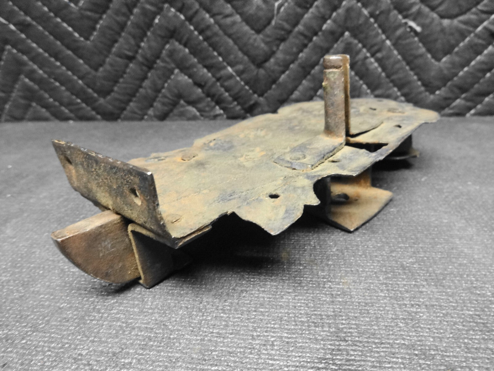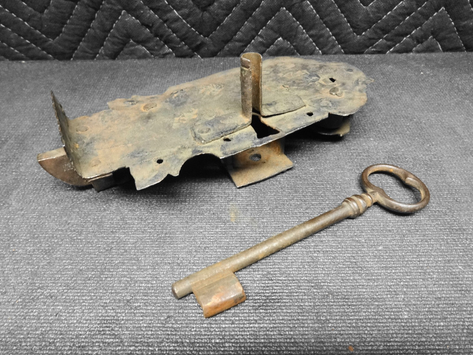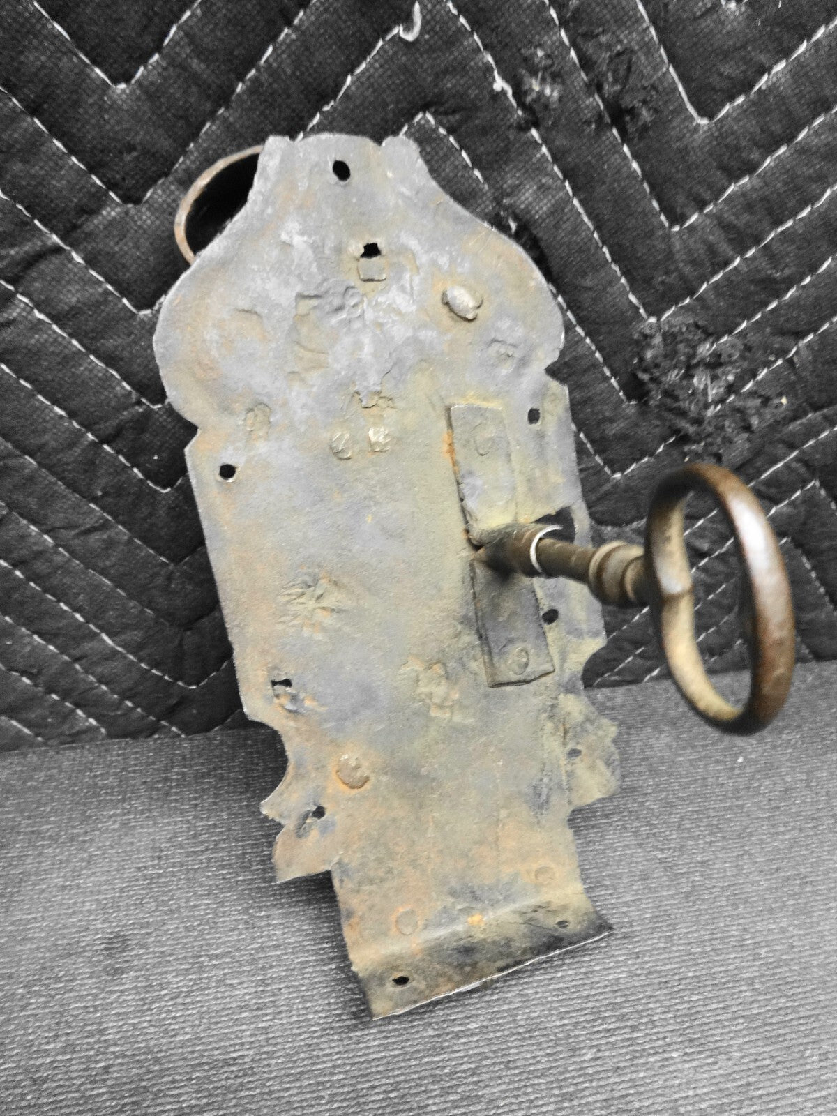 Measures 8" across, 4" tall. Antique lock, wrought iron lock, 17th-century hardware, medieval-style lock, hand-forged lock, rustic door lock, iron door latch, old world lock, cast iron key, ornate lock mechanism, vintage iron lock, historic door hardware, heavy-duty iron lock, gate lock, castle lock, antique skeleton key.