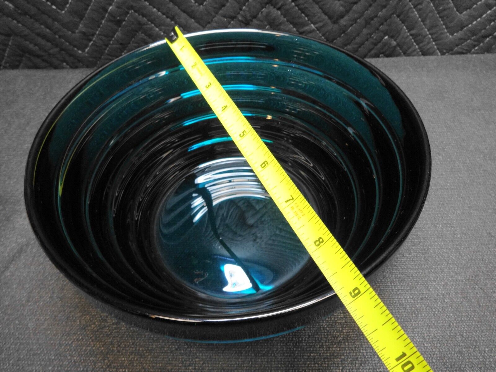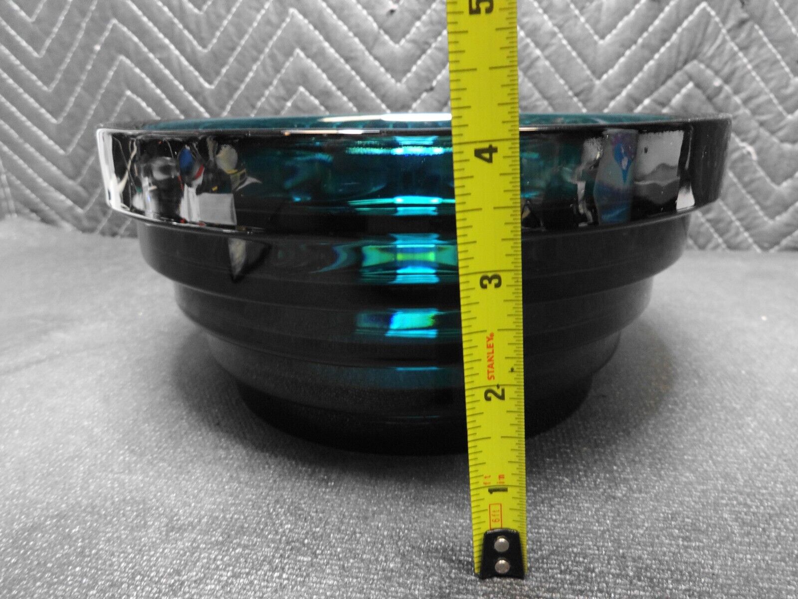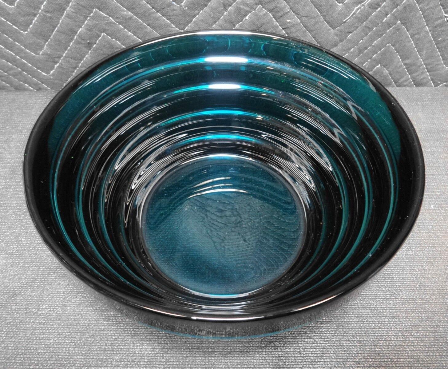 Up for sale is this Blue-Green French Art Deco molded crystal center or fruit sky-scraper bowl in heavy crystal, circa 1930.