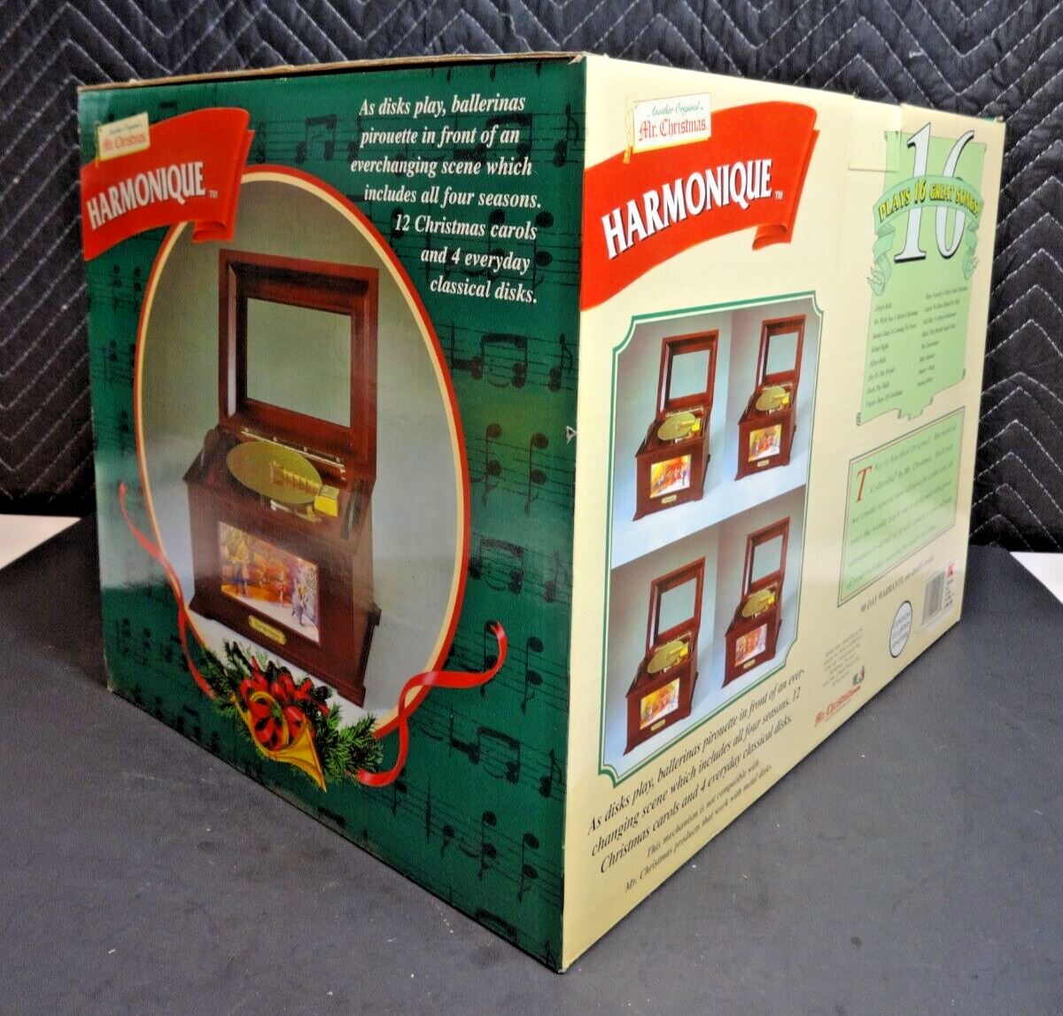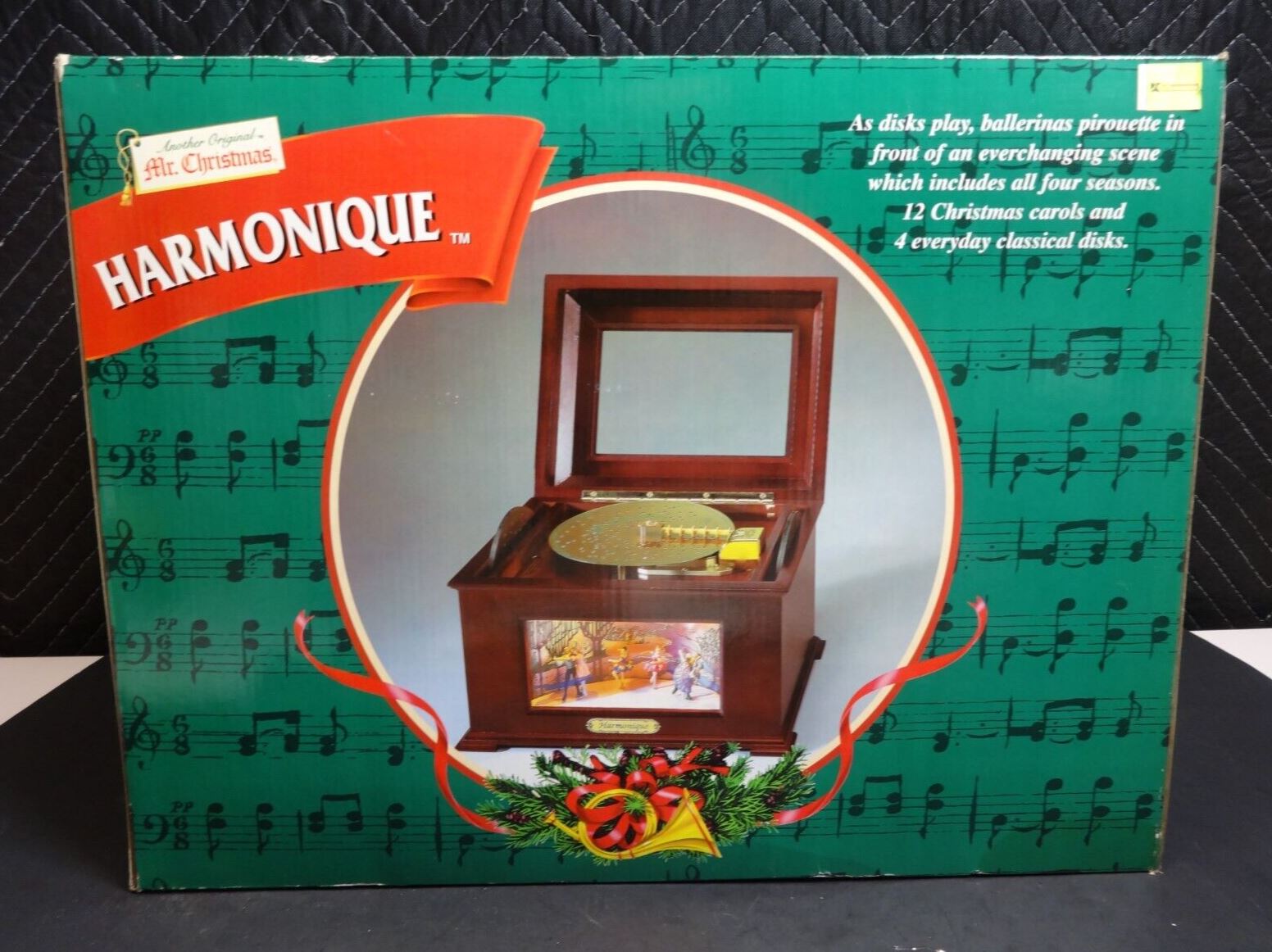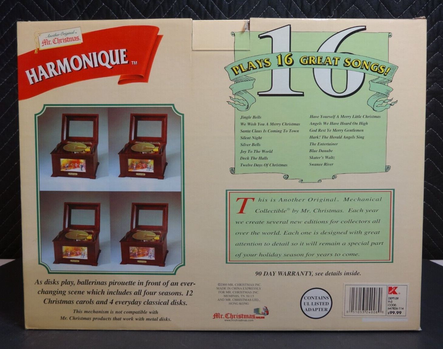 Up for sale is this 2000 Mr Christmas Harmonique Music Box w Animated Ballet Dancers & 16 Music Discs new from old stock from the estate of a collector. The original purchase receipt is included.