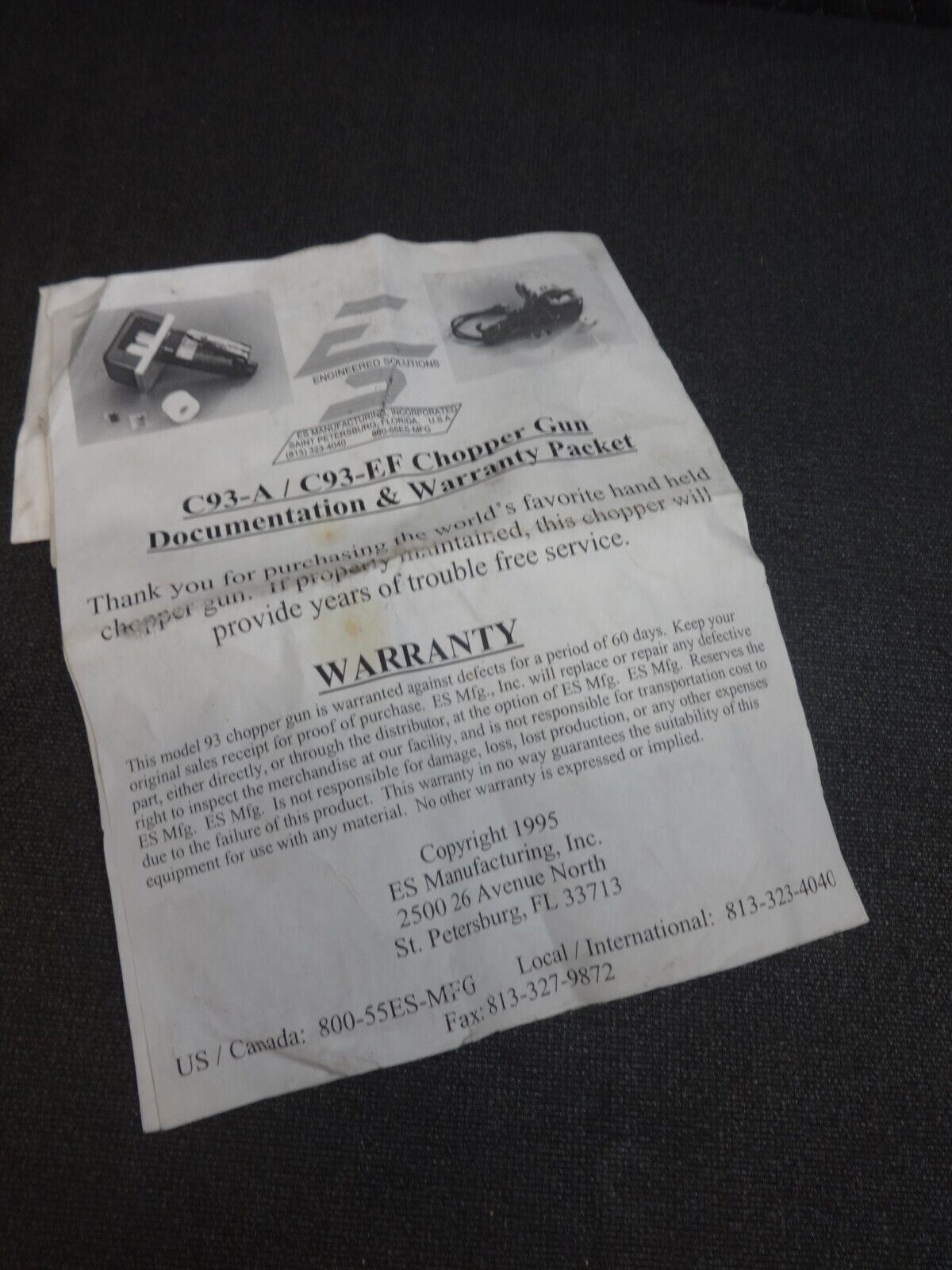 Up for sale is this Electric Fiberglass Chopper Gun by Engineered Solutions, Model C93-EF w/ Original Instruction Papers
