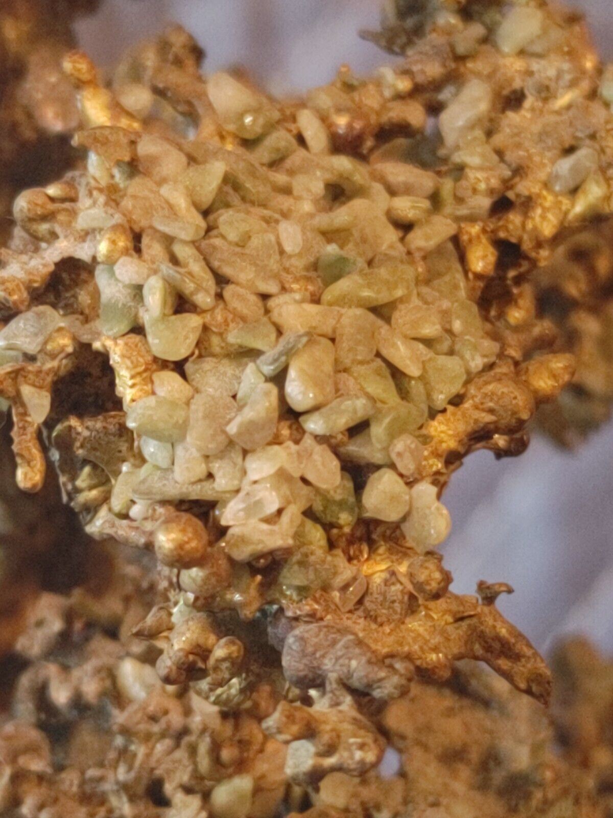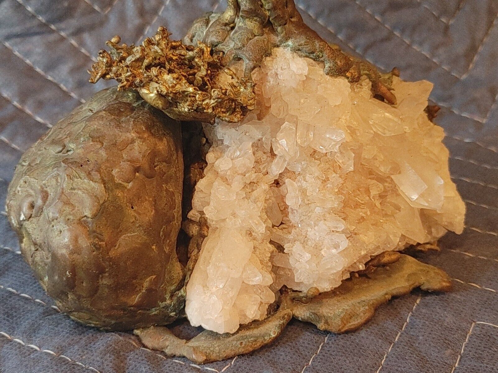 Hand made of Bronze, semi precious stones and clear quartz crystal geode