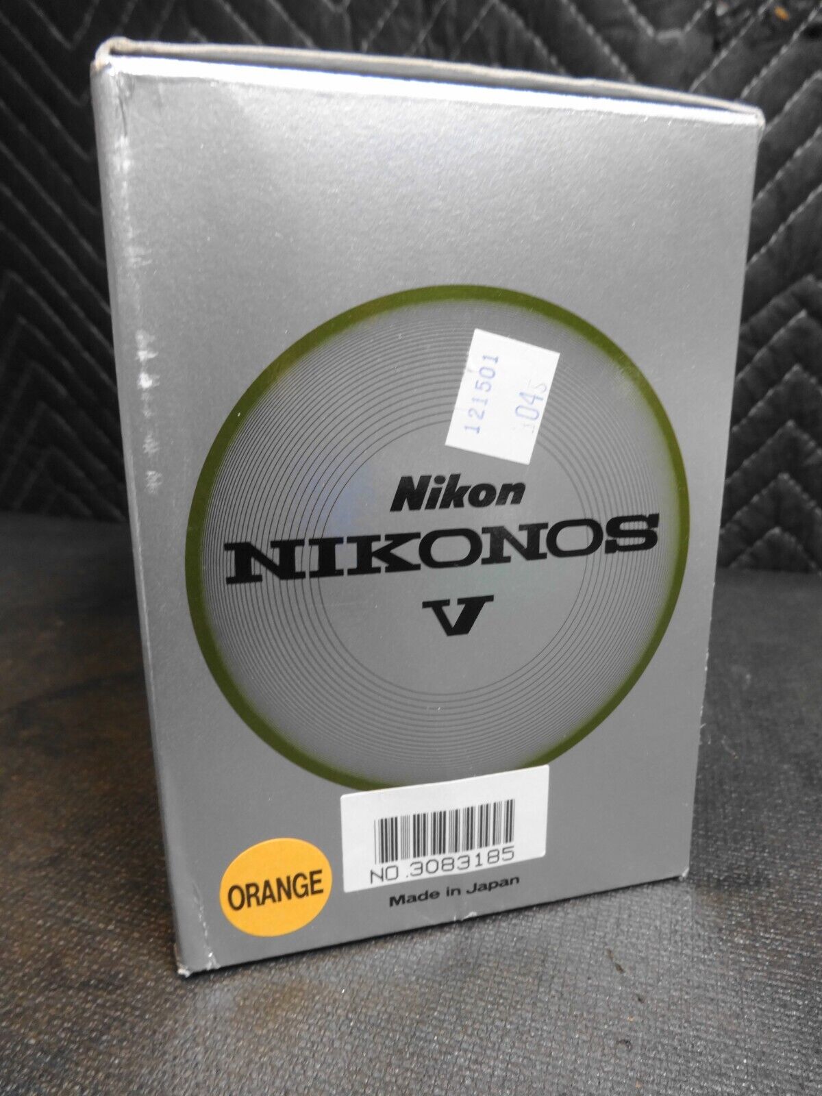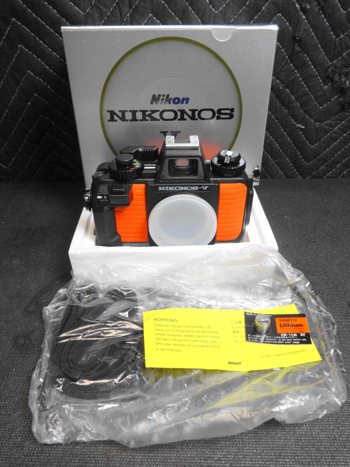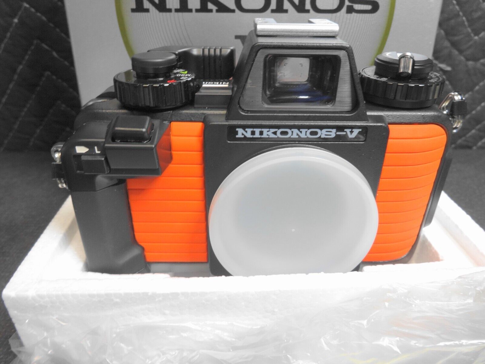 Up for sale is this [Unused in Box] Nikon Nikonos V Orange Underwater Film Camera. It includes it's original lanyard strap, retail box w/ foam inserts and body cap. This camera comes from the estate of a rescue diver who worked for the Sheriff in Ventura County, CA. There are marks on the battery cap that I left while checking to be sure that the battery compartment was empty and free of any battery corrosion.