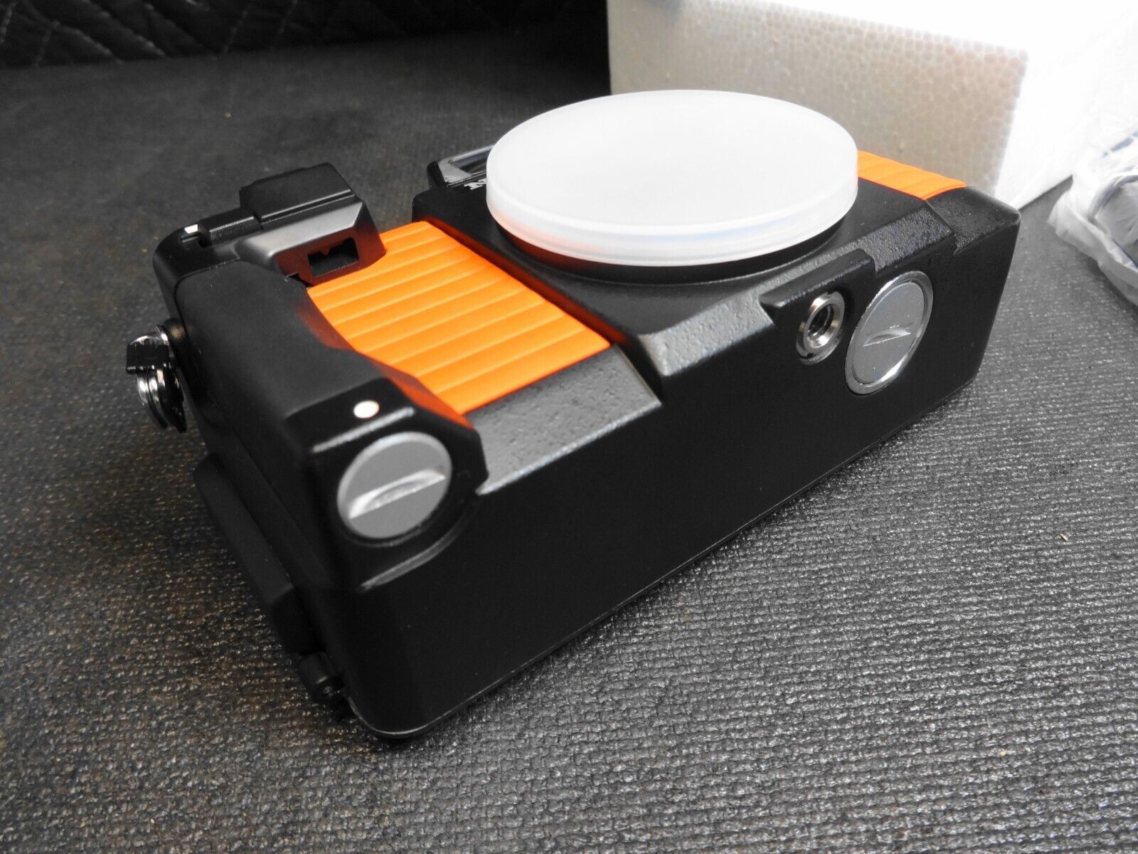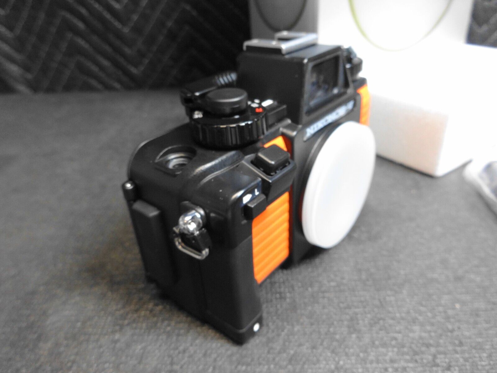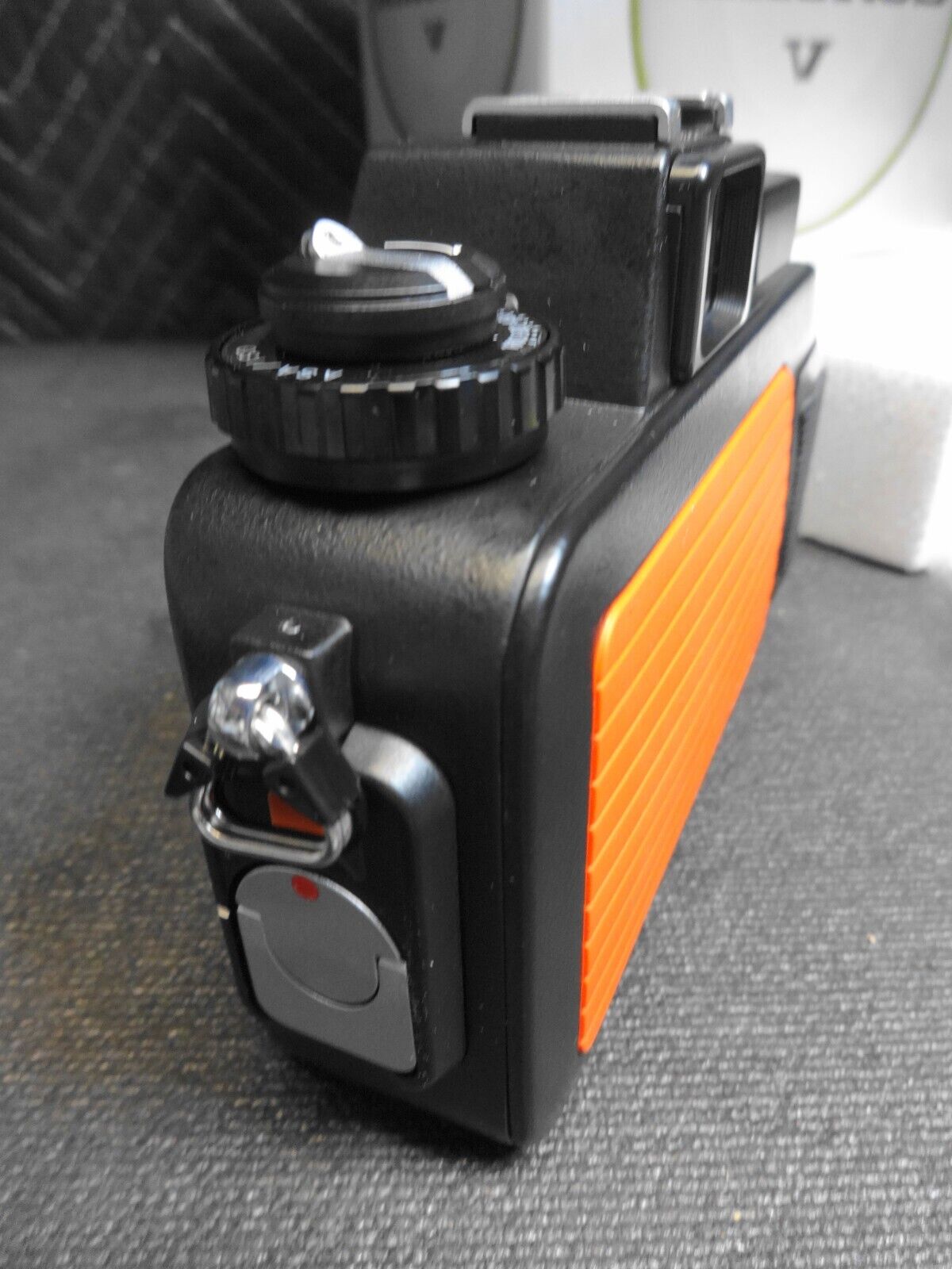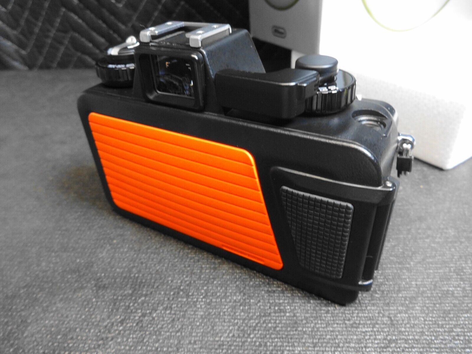 Up for sale is this [Unused in Box] Nikon Nikonos V Orange Underwater Film Camera. It includes it's original lanyard strap, retail box w/ foam inserts and body cap. This camera comes from the estate of a rescue diver who worked for the Sheriff in Ventura County, CA. There are marks on the battery cap that I left while checking to be sure that the battery compartment was empty and free of any battery corrosion.